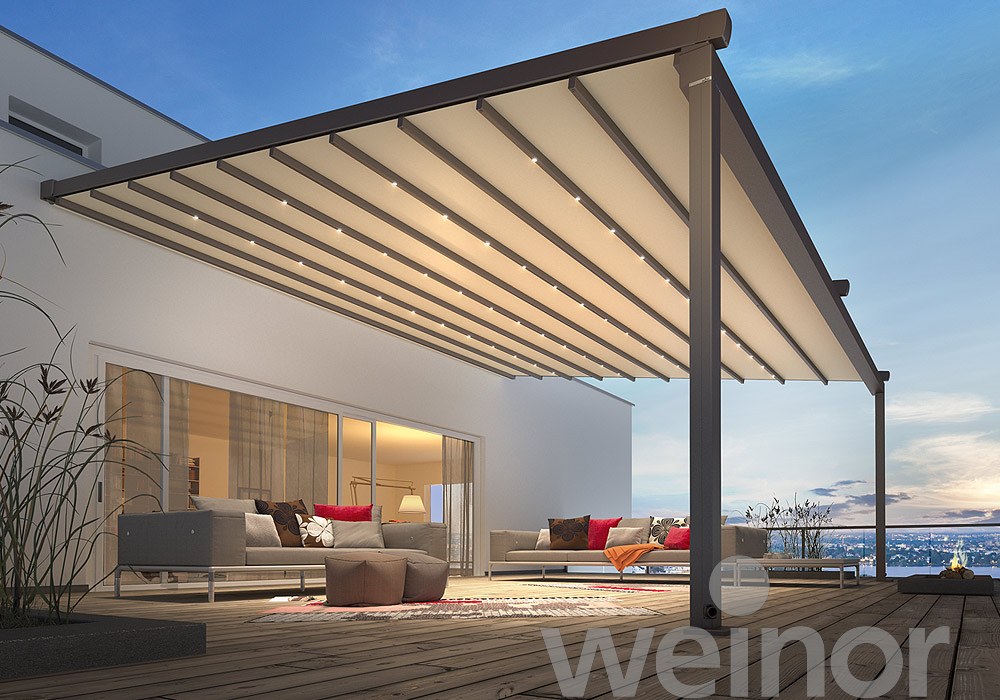 Flexibel vouwdak PergoTex van weinor de bescherming tegen zon wind en regen Het nieuwe vouwdak PergoTex typ A. Het vouwdak kan zowel als zonnescherm en als regendak worden gebruikt en het terras transformeren in een leefruimte of buitenruimte met mediterrane flair. Met de PergoTex breidt weinorspecialist Veldman haar productassortiment op het gebied van terrasdaken verder uit. De Zon en regenwering heeft een scheurbestendige, lichte en waterdichte PVC bespanning garandeert een buitengevoel in bijna alle weersomstandigheden. De zelfdragende constructie, op basis van de WeiTop-Terrazza-techniek, zorgt zelfs tot winkracht 8 voor de nodige stabiliteit. “We zijn trots om ons nieuwe vouwdak te introduceren. Voor het eerst voorzien we in een terrasdak, dat tegelijkertijd zowel stabiel en flexibel is, en dat zowel bij zon als ook bij regenweer benut kan worden. In tegenstelling tot andere daken biedt het de mogelijkheid te openen en te sluiten zoals een cabriolet. De zon en regen weering Pergotex kan in 1 deel afmetingen aan tot 7 meter breed en 6,5 meter diep. Praktische constructie en discrete uitstraling. De zelfdragende constructie combineert twee uitgekristalliseerde systemen in een: Het transportprofiel van het vouwdak wordt op de WeiTop Terrazza geïnstalleerd, die zich inmiddels al bewezen heeft als zon en windwering. De staanders kunnen in de vloer in beton worden gestort of, afhankelijk van de lokale omstandigheden, geschroefd worden. Bevestigingsconsoles zijn in de muur verankerd en met een afdekplaat aan de zijkant bedekt en beschermd, voor een perfecte pasvorm en een discrete uitstraling. De beweegbare aluminium dwarsbalken van het vouwdak, in combinatie met het scheurbestendige PVC zorgen voor een hoge windstabiliteit. Zelfs bij een minimum helling van 8˚ loopt het regenwater in uitgeschoven toestand naar voren in de dakgoot en via de staanders weg. Wanneer de PergoTex is ingeschoven, liggen de PVC bespanning en de dwarsbalken onder een aluminium afdak. Met een moderne wandschakelaar wordt een robuuste elektrische motor gestart, die het vouwdak traploos in- en uitschuift. De draaimoment-uitschakeling in de motor zorgt voor een strak doek, zelfs met uitzetting door temperatuurschommelingen. De zeer scheurbestendige, UV- absorberende en waterdichte PVC- bespanning is standaard in de kleuren wit en beige te verkrijgen, en tegen meerprijs in andere kleuren. Weinor producten als completering Het nieuwe vouwdak kan worden aangevuld met diverse extra apparatuur. Bijvoorbeeld, door de glazen schuifdeur w17-c, die als onderbouwelement maximale transparantie en bescherming tegen de wind biedt. Het trapeze tussen de voor de beglazing noodzakelijke dwarsbalk en de dakconstructie kan optimaal gesloten worden met een transparant doek of met vaste glaselementen. Bovendien is de bevestiging van de verticale zonwering VertiTex van weinor mogelijk.